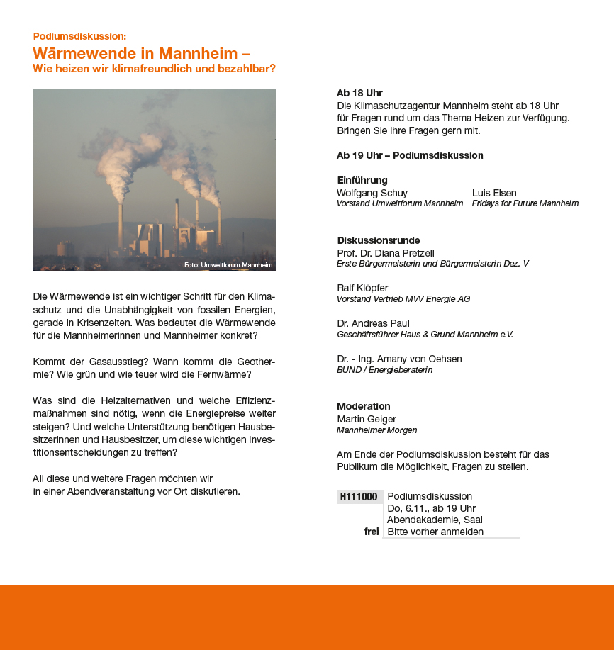 Podiumsdiskussion zur Wärmewende in Mannheim, 06.11., 19 Uhr in der Abendakademie